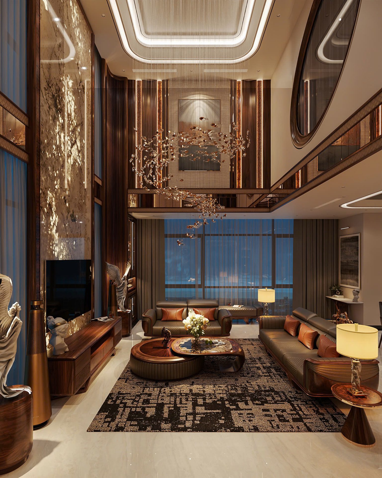 Trong biệt thự, phòng khách thường được đầu tư mạnh về vật liệu. Các hạng mục như vách ốp tường, kệ TV, sofa gỗ, bàn trà gỗ óc chó tạo nên không gian tiếp khách sang trọng, thể hiện rõ cá tính và đẳng cấp gia chủ.