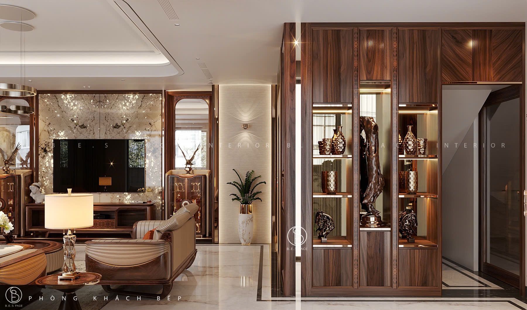 Sảnh là khu vực tạo ấn tượng đầu tiên khi bước vào biệt thự thời đại. Nắm được tinh thần phải tạo ấn tượng từ cái nhìn đầu tiên của gia chủ, BESPACE chú trọng thiết kế vách ốp gỗ óc chó kết hợp vật liệu cao cấp để tạo nên sự quý phái, sang trọng cho không gian này.