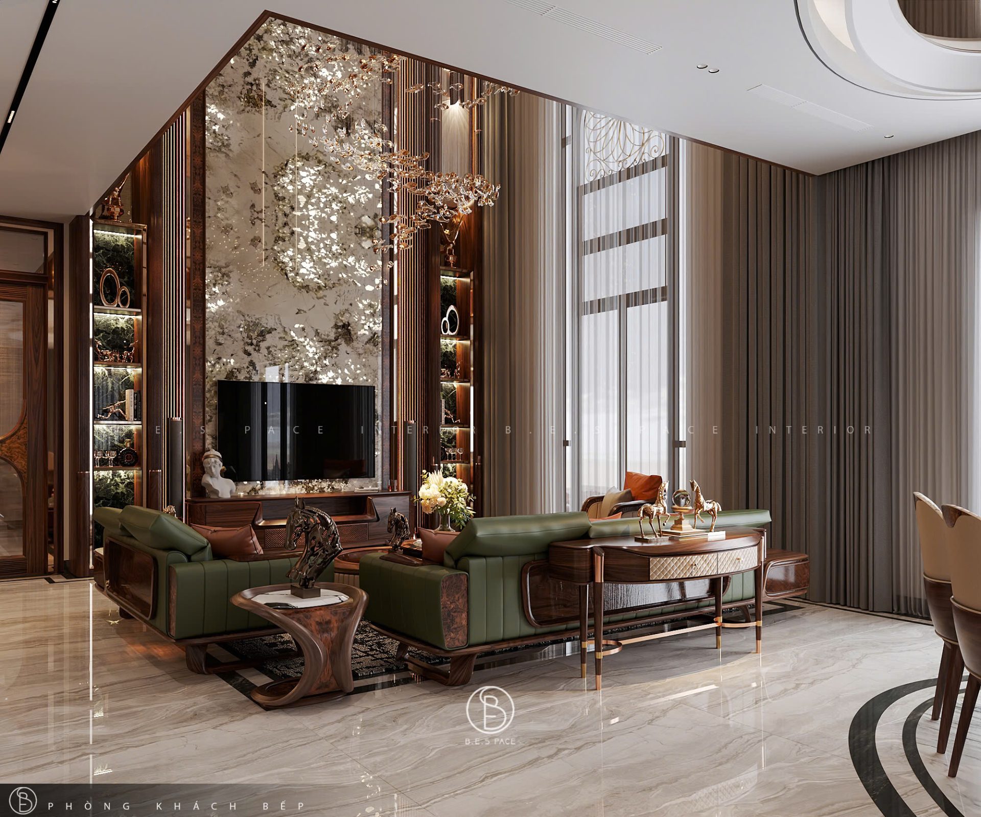 • Nội thất phòng khách: vách ốp, kệ TV, sofa gỗ
