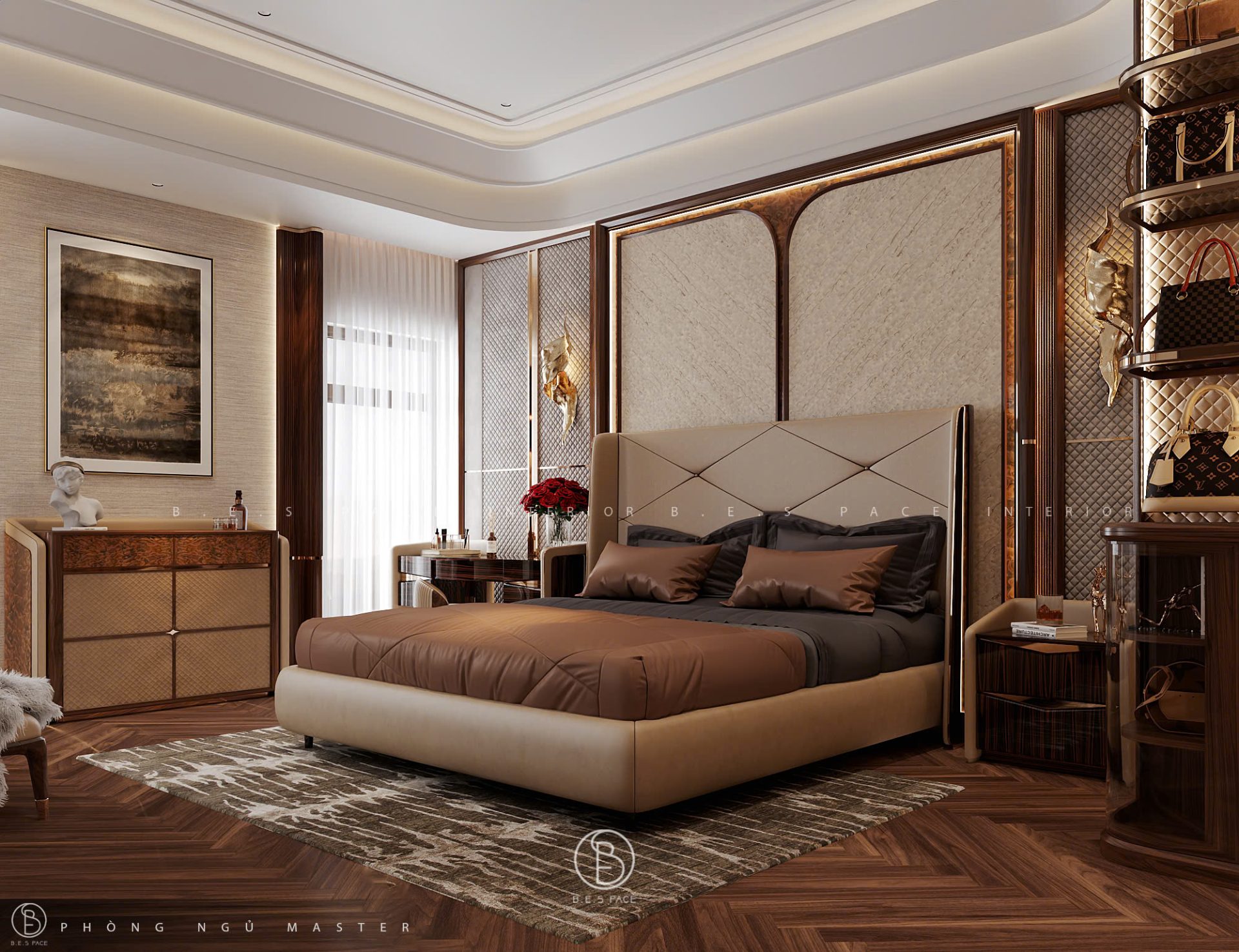 Phòng ngủ Master: Tích hợp không gian thay đồ (walk-in closet) sang trọng và khu vực thư giãn bên cửa sổ (bay window) để gia chủ tận hưởng những phút giây tĩnh lặng.