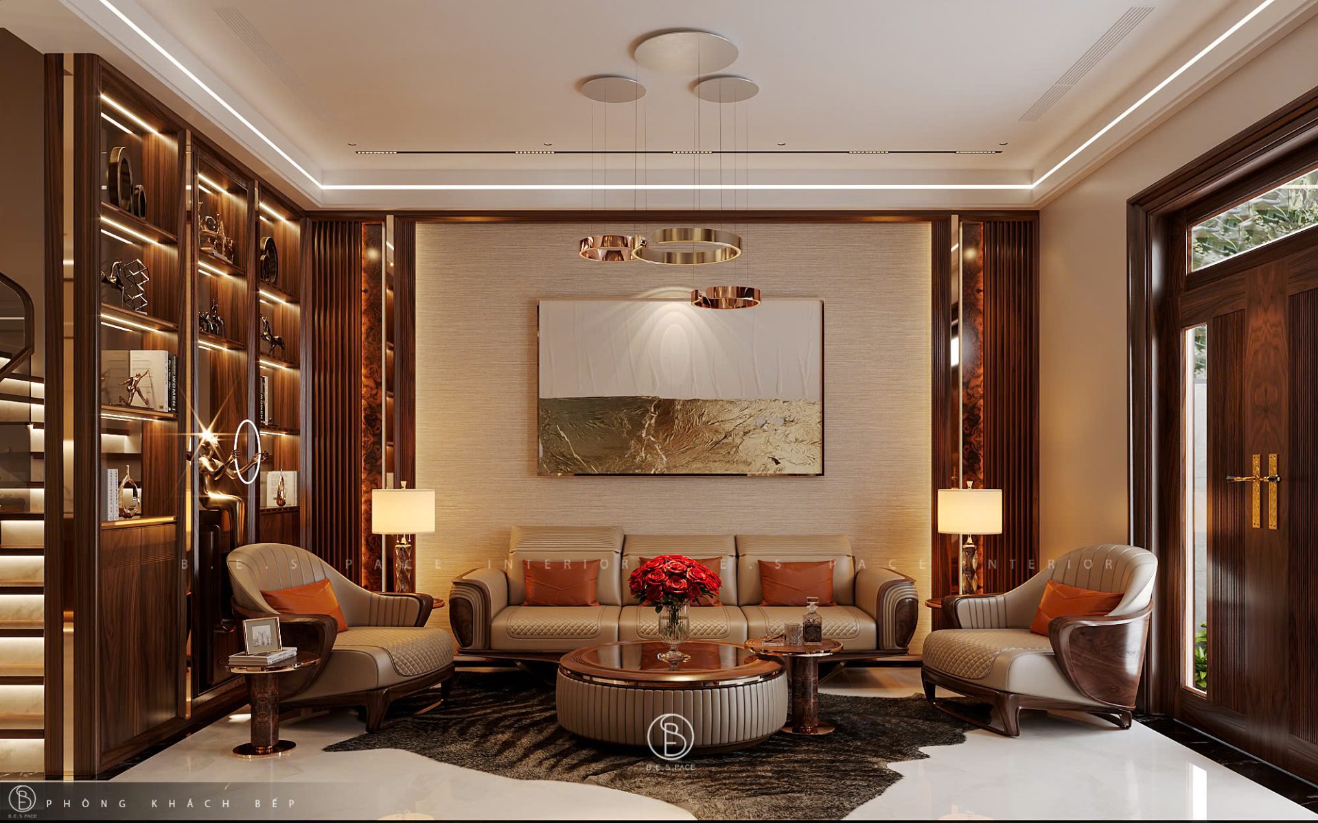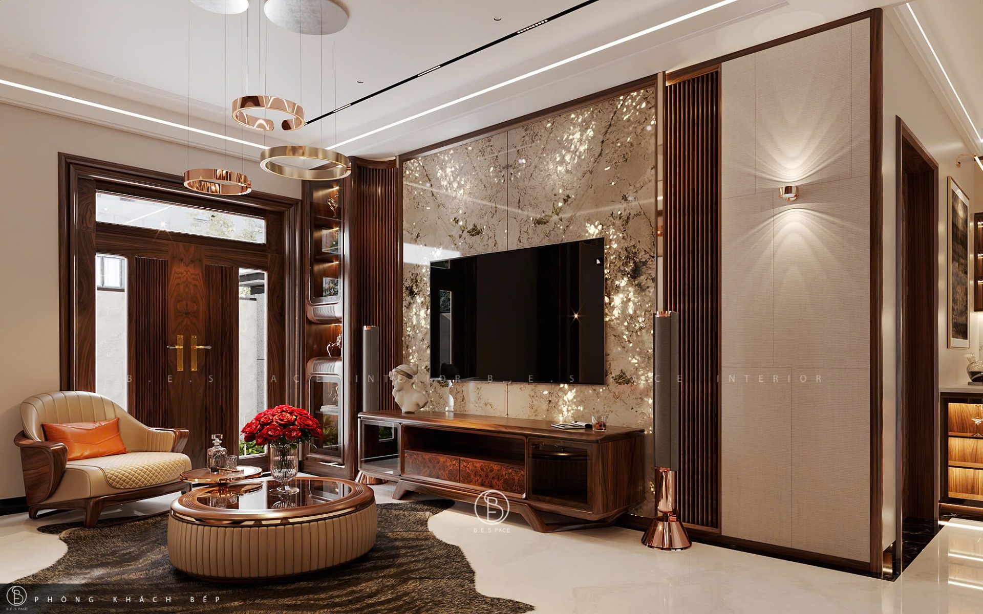 Nâng tầm vị thế với thiết kế phòng khách gỗ óc chó thượng hạng. BESPACE kiến tạo không gian đẳng cấp qua những đường cong tinh tế và nghệ thuật sắp đặt ánh sáng.